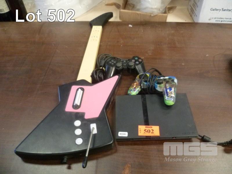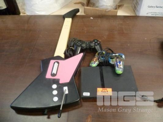 PS2 GAME CONSOLE, 2 x CONTROLLERS, NO CABLES & FRONTMAN GUITAR
