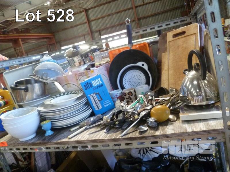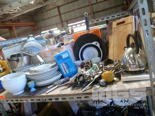ASSORTED COOKWARE, UTENSILS, CUTLERY, PLATES, ETC