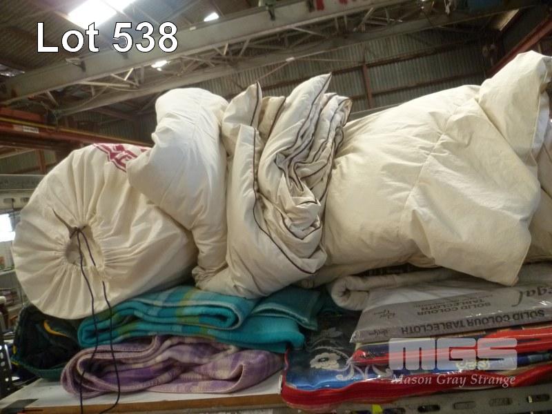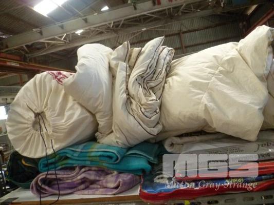 ASSORTED BEDDING, SLEEPING BAG, TOWELS, ETC.