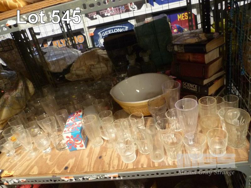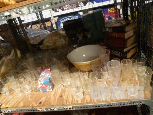 ASSORTED GLASSWARE, LARGE BOWL, BOOKS, ETC.