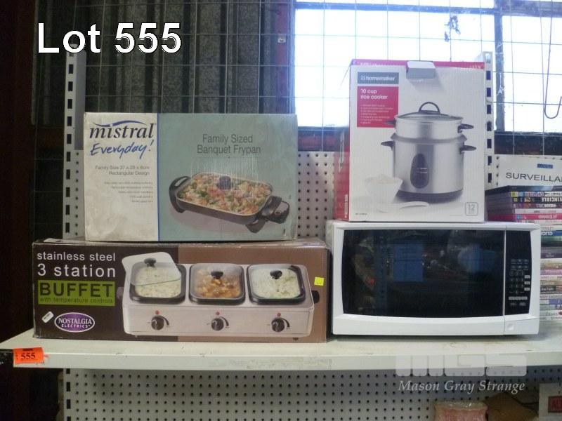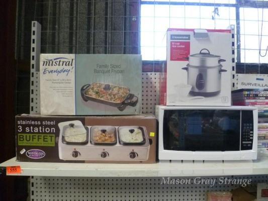 NOSTALGIA 3 STATION BUFFET, MISTRAL FAMILY SIZE FRY PAN, HOMEMAKER 10 CUP RICE COOKER & MICROWAVE OVEN
