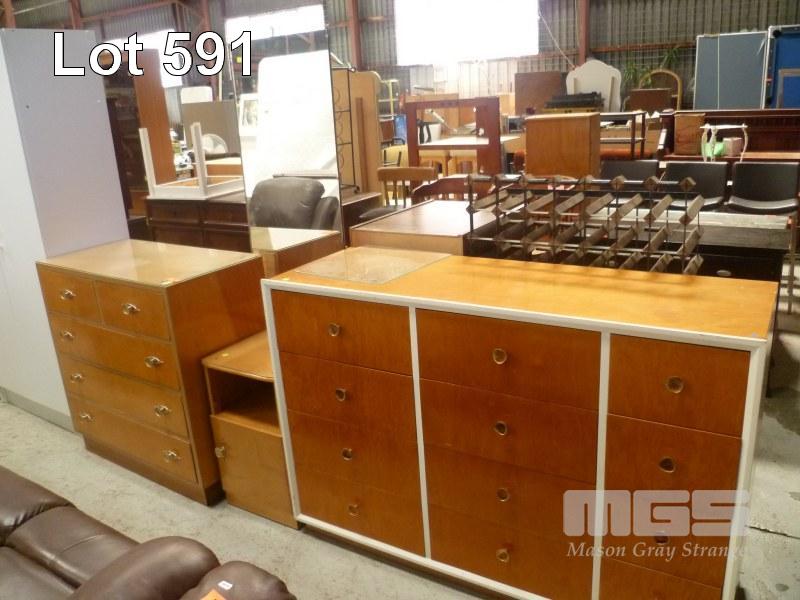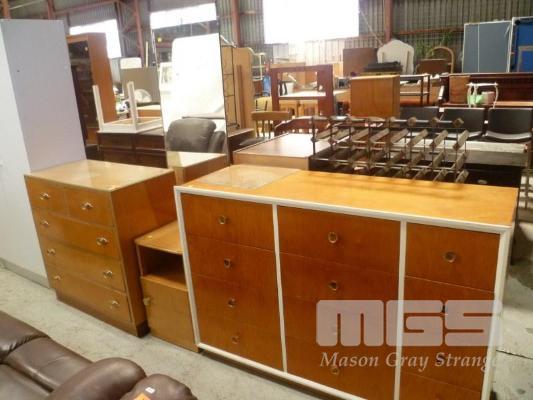 CHEST DRESSER WITH SIDE MIRROR, TIMBER VENEER CHEST OF DRAWERS, 5 DRAWER, TIMBER VENEER AND BEDSIDE CABINET
