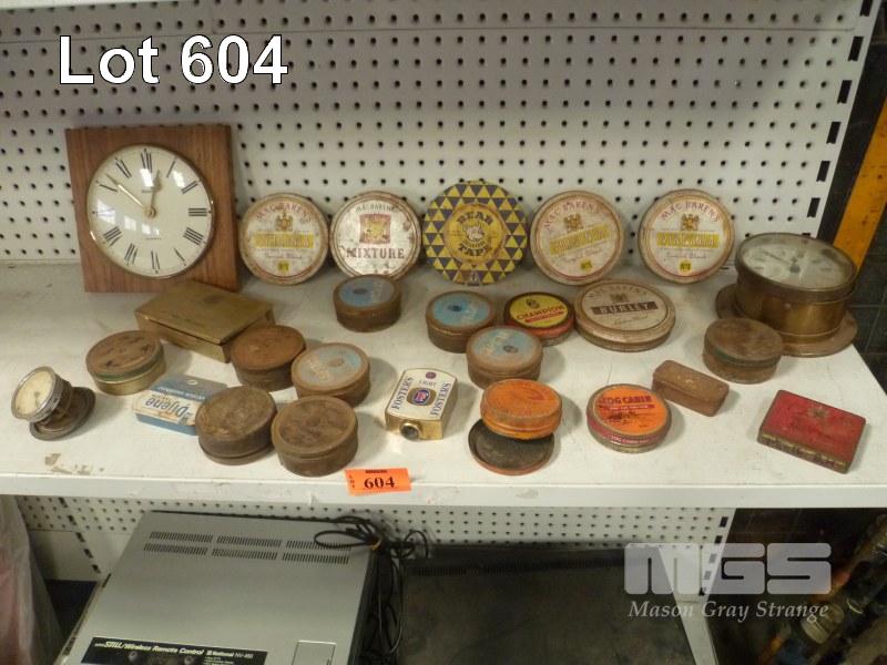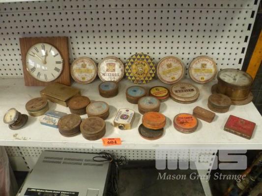 QTY TOBACCO TINS IN BEAR, VIRGINIA, ETC. & CLOCKS