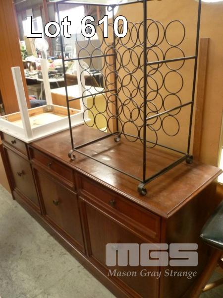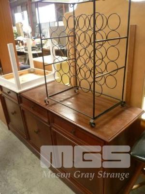 TIMBER SIDEBOARD, 3 x DRAWER/DOOR, (ALL FAULTS - BLISTERING ON TOP, DAMAGE TO SIDE PANEL) WIRE WINE RACK, WHITE TIMBER SIDE TABLE