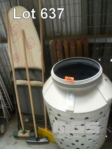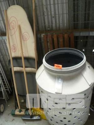 LARGE PLASTIC DRUM, BROOMS & IRONING BOARD