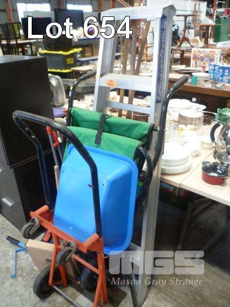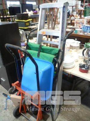 ASSORTED GARDENING TOOLS, ALUMINUM STEP LADDER & SACK TRUCK