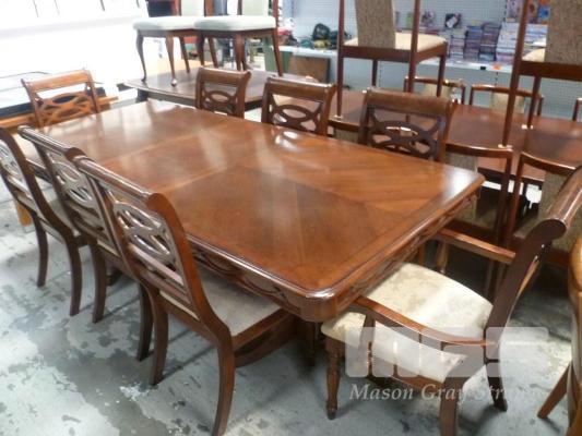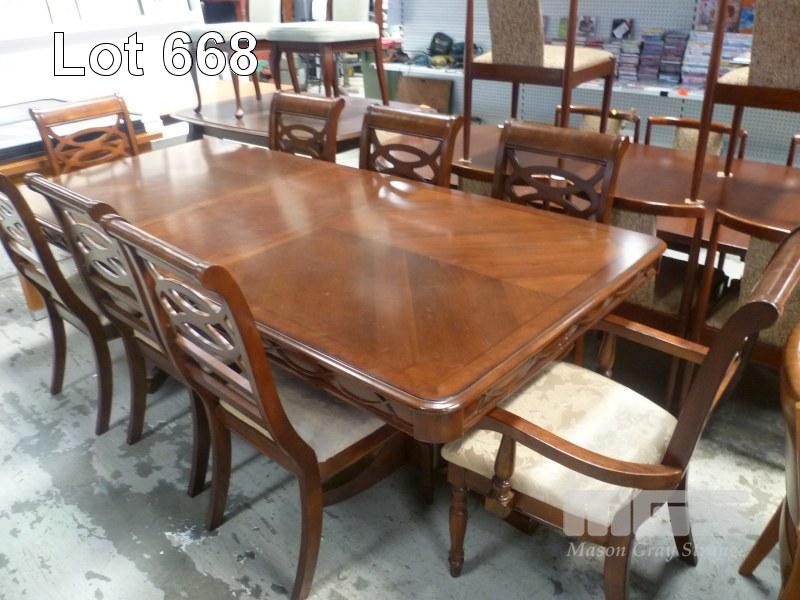 DINING SUITE, POLIHSED TIMBER, 9 PIECE RECTANGULAR EXTENSION TABLE, SINGLE LEAF 2 x PEDESTAL LEGS & 8 x SLEIGH BACK DINING CHAIRS