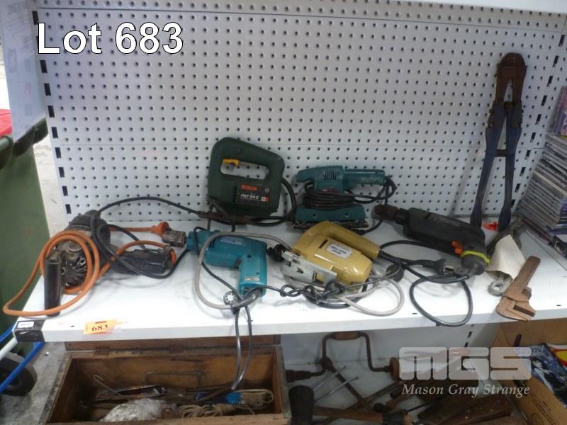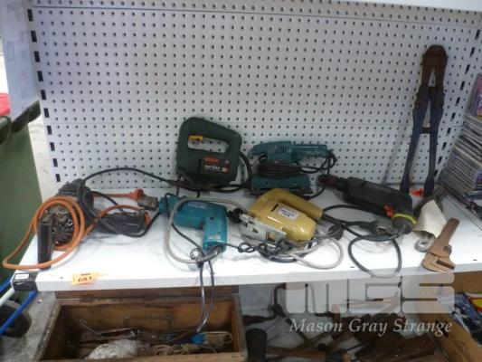 QTY POWER TOOLS, INCL BOSCH JIGSAW, SANDER, DRILL RECORD BOLT CUTTERS