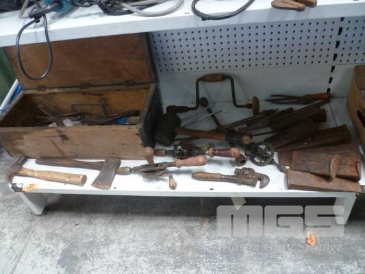 QTY VINTAGE TOOLS, INCL HAMMERS, STILLSON, WRENCH, LOG SPLITTERS WOOD BOX, ETC.