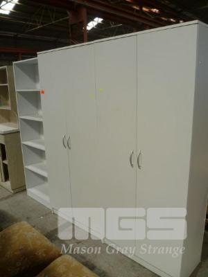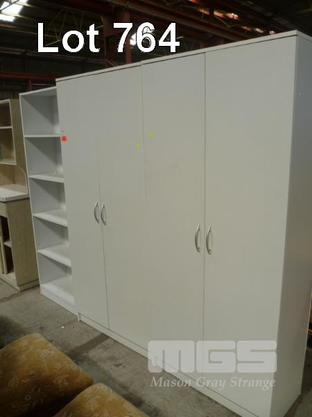 2 x WHITE LAMINATE BROOM CUPBOARDS & BOOKCASE