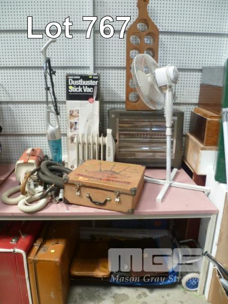 ASSORTED SUITCASES, BAGS, STICK VACS, HEATERS, PEDESTAL FAN, ETC.