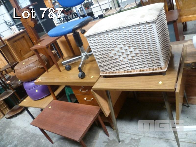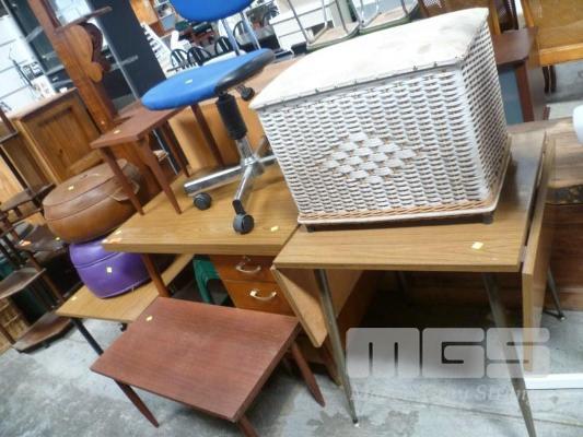 2 x VINYL POUFS, LAMINATE COFFEE TABLE, LAMINATE DESK LAMINATE DROP SIDE TABLE, TIMBER COFFEE TABLE, SIDE TABLE, OFFICE & PLASTIC STOOLS