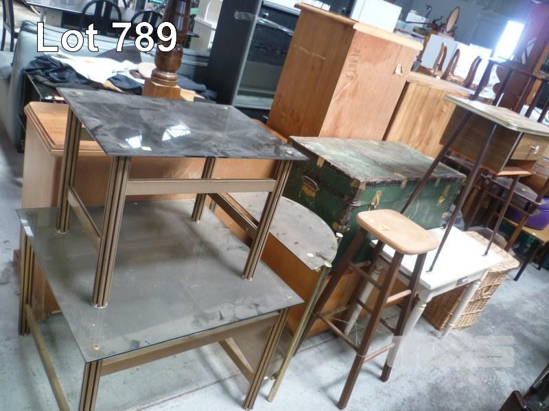2 x COFFEE TABLES, GLASS TOP, GLASS SHELF UNIT TIMBER STOOL, TELEPHONE TABLE, SIDE TABLE TRUNK MOBILE CABINET, CANE LAUNDRY BASKET & BIN