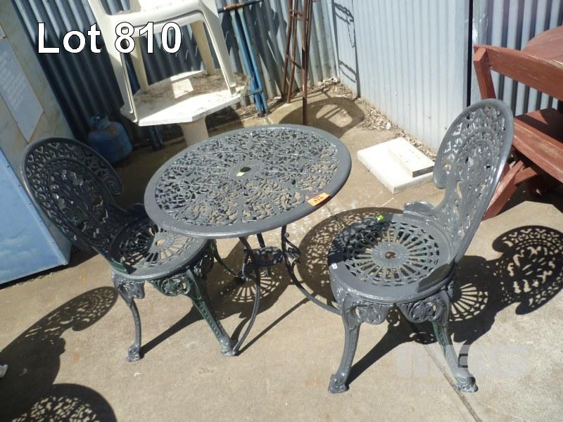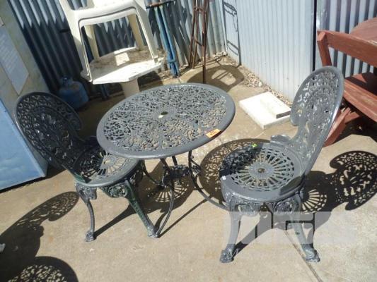 GREY CAST ALUMINIUM 3 PIECE OUTDOOR SETTING INCLUDING ROUND TABLE & 2 x CHAIRS
