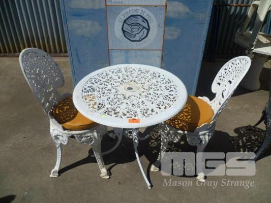 WHITE PAINTED CAST ALUMINUM 3 PIECE OUTDOOR SETTING, 2 x CHAIRS & ROUND TABLE