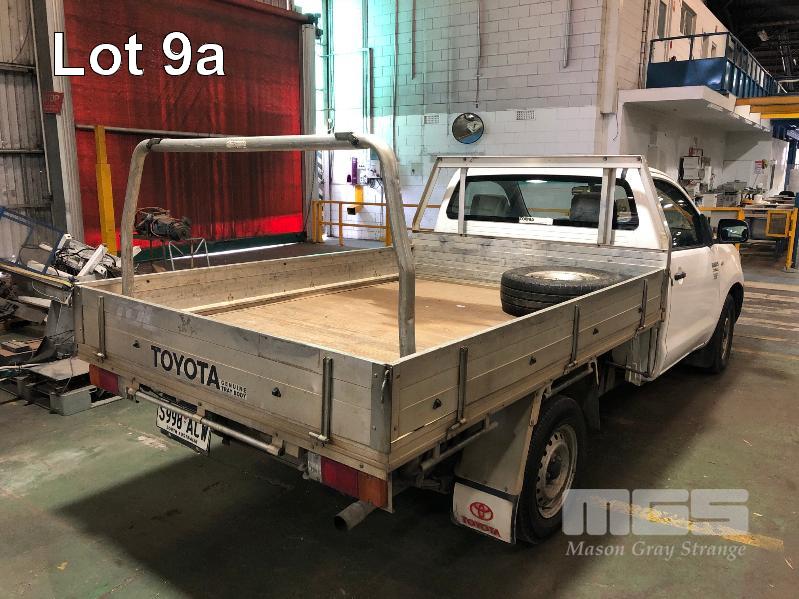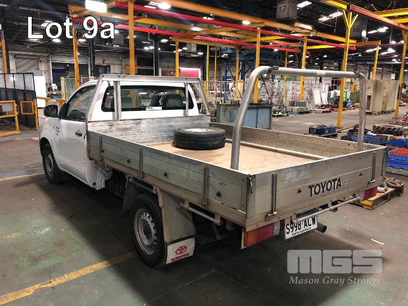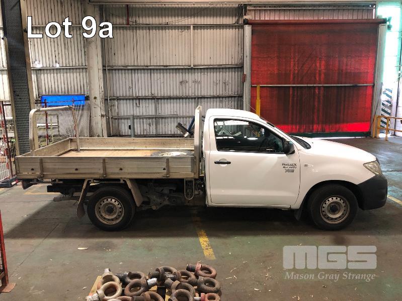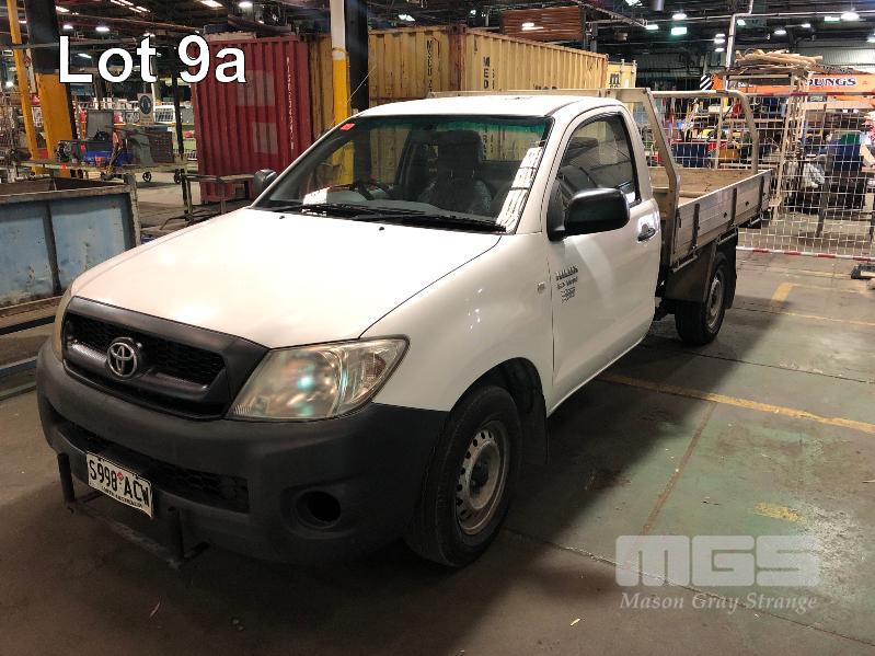 2009 TOYOTA HILUX WORKMATE 2.7 VTi 150 SERIES SINGLE CAB UTILITY REG: S998 ACW (SA) VIN: MR0CX12G700043616 ENG: 2TR6679621 ODO: 615,000kms SHOWING 5 SPEED MANUAL TRANSMISSION, PETROL/LPG, WHITE DUCO, 2 DOORS, 3 SEAT, AIR CON, CD PLAYER, SPARE WHEEL, GVM: 2,780kg DUAL AIR BAG DROP SIDE GENUINE TOYOTA ALLOY TRAY, 2400 x 1760mm (2 x PALLETS) LADDER RACKS KEY #43 (WITH PAPERS, WITH 1 KEY/S, WITH OWNER'S MANUAL, NO SERVICE BOOKS) CONDITION: - SLIGHT MISS AT IDLE - MINOR SCRATCHES