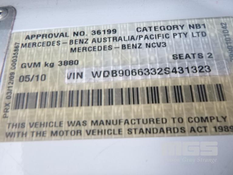 MERCEDES SPRINTER 319 AMBULANCE RWD REG: N/A VIN: WDB9066332S431323 ODO: 331,061kms SHOWING V6, 5 SPEED AUTOMATIC TRANSMISSION, DIESEL, WHITE DUCO, 4 DOORS, 4 SEAT, RWD ABS, AIR BAG, AIR CON, BULL BAR, CRUISE CONTROL, FOG LAMPS, POWER STEERING, POWER WINDOWS, SPOT LIGHTS, BARN DOORS, 2 x SLIDE DOORS AMBULANCE FIT OUT POLY BULL BAR KEY #65 (WITH 1 KEY/S, WITH OWNER'S MANUAL, NO SERVICE BOOKS) CONDITION: - ENGINE WARNING LIGHT - TAPING SOUND IN ENGINE - SCRATCHES