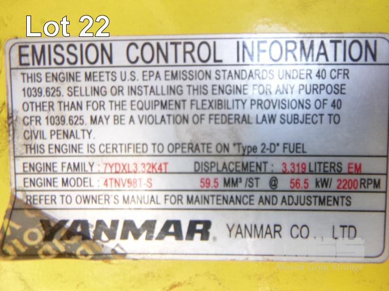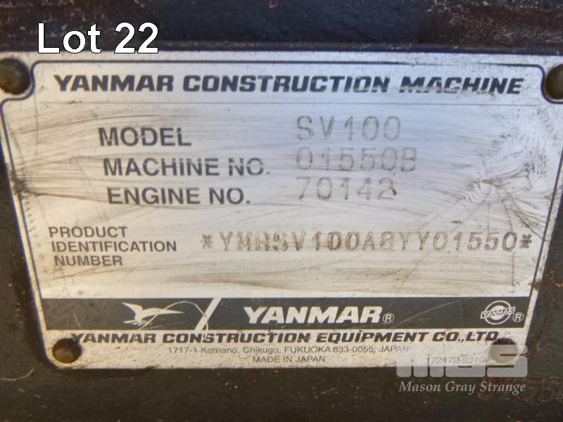 YANMAR SV100 EXCAVATOR PIN: YMRSV100A04Y01550 ENG: 70142 PLANT NO: 015508 HOURS: 6,367 SHOWING GVM: 20,950 kg YANMAR, 3.3 LITRE, DIESEL, MOD: 4TNV98T-S, PLUMBED AUX, QUICK HITCH, 230cm PUSH BLADE STEEL TRACKS, ROPS CAB WITH 90cm DIG BUCKET 45mm PINS, 250, 850 & 1200mm BUCKETS KEY #19 (NO PAPERS, NO OWNER'S MANUAL, NO SERVICE BOOKS)