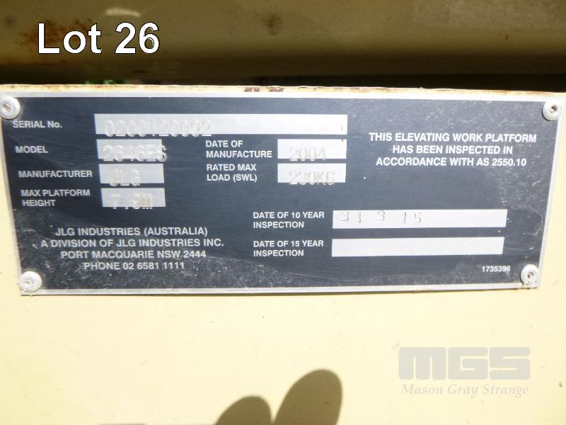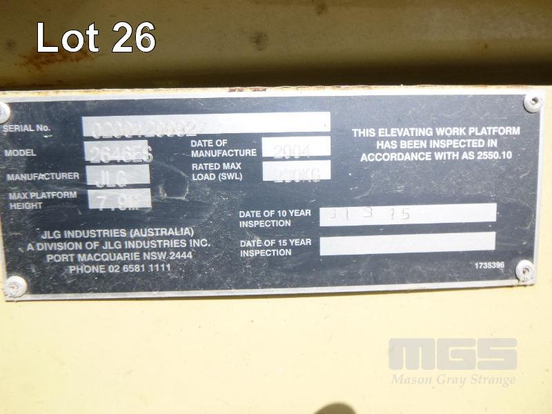 SCISSOR LIFT, EWP JLG PRO-FIT SERIES MOD: 2646ES S/NO: 0200120092 DOM: 2004 MAX PLATFORM HEIGHT: 7.9m SWL: 230kg 10 YEAR INSPECTION DATE: 31/3/15 BOOKS, NO KEY
