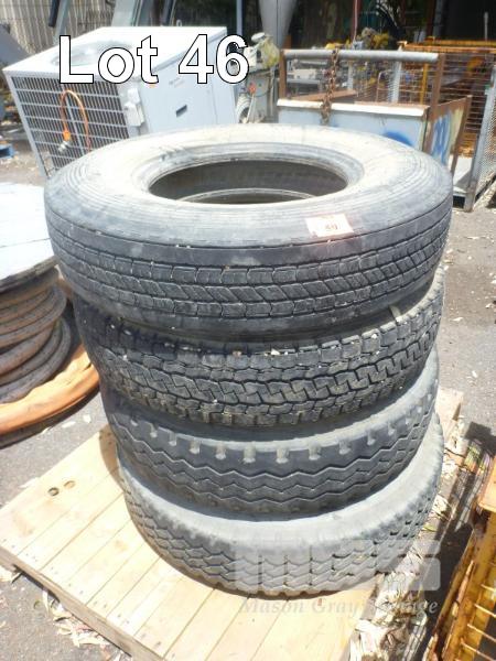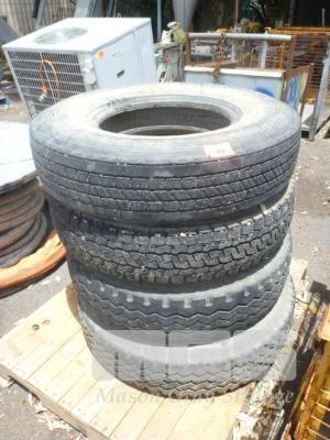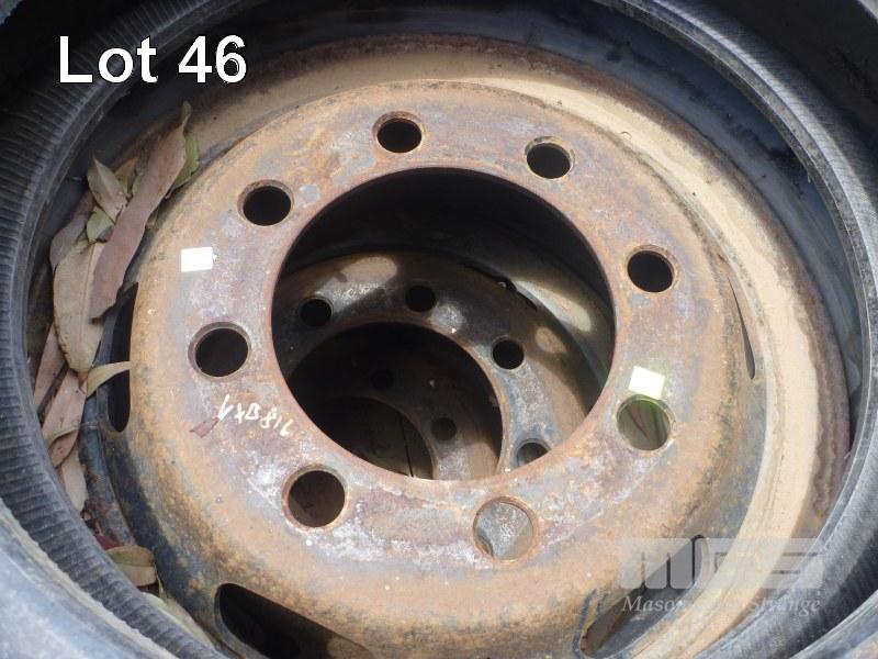 3 x STEEL TRUCK RIMS & 4 x TYRES, 9.00 R20 141/138L, 8 STUD