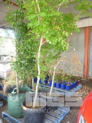 2 x POTTED GOLDEN RAIN TREES, DAMAGED STEMS, 17" POTS