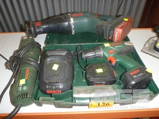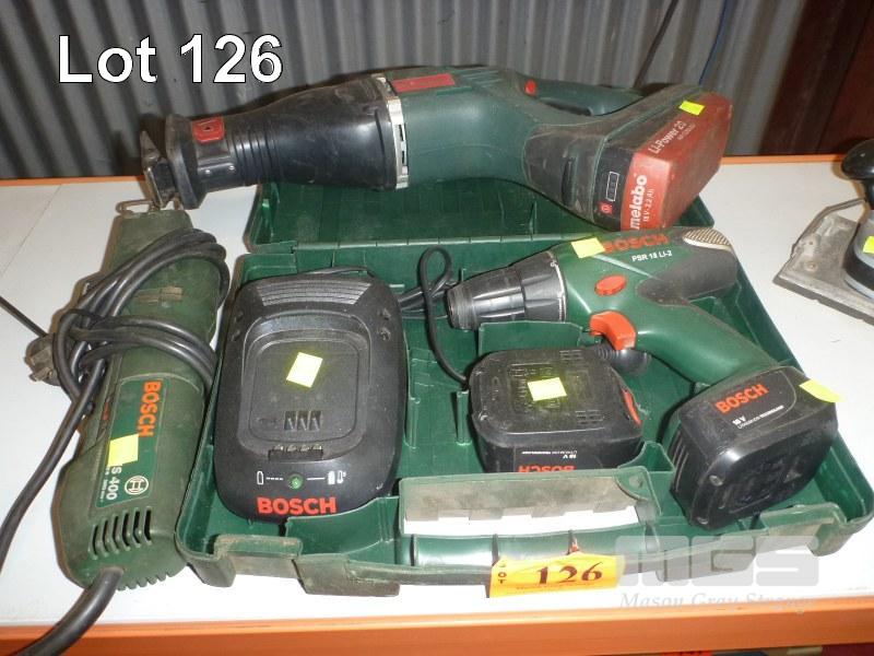 3 x BOSCH POWER TOOLS, 18V RECIPROCATING SAW, MOD: ASE18 1 x BATTERY, JIGSAW, MOD: PMS400, 240V, 18V DRILL MOD: PSR18Li-2 2 x BATTERIES, CHARGER & CASE