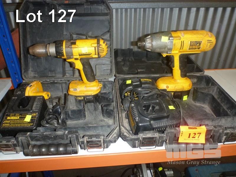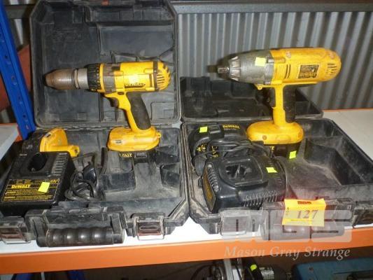 2 x DEWALT CORDLESS POWER TOOLS, 18V IMPACT WRENCH, 1/2" 2 x BATTERIES & CHARGER, 14.4V HAMMER DRILL, 2 x BATTERIES & CHARGE WITH CASES