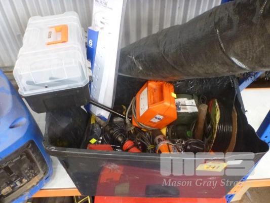 ASSORTED TOOLS, ECB, SOLDERING IRON, RIVETER, DRILL, WEED CLOTH ETC (1 x TUB)