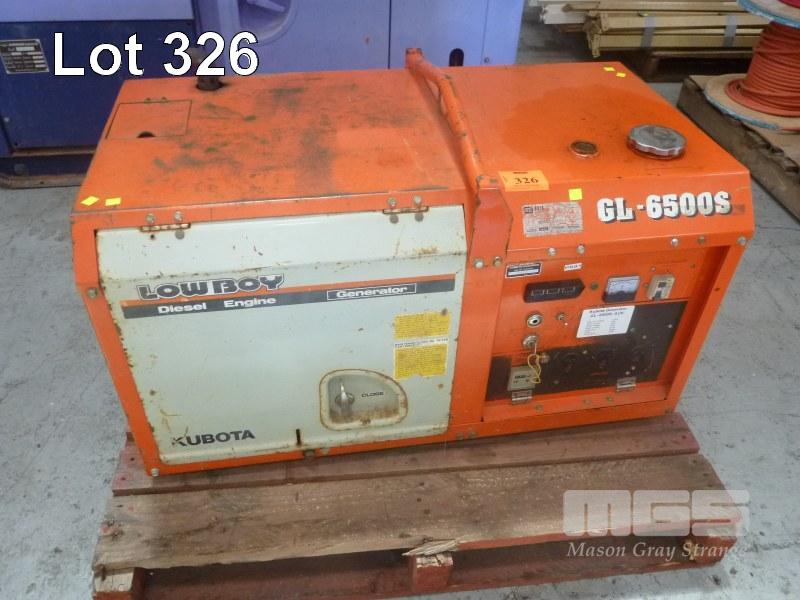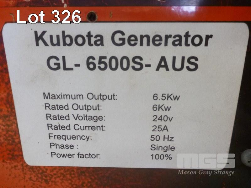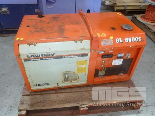 DIESEL GENERATOR KUBOTA LOW BOY MOD: GL-6500S HOURS: 1635 INDICATED 6kw, 240V, 25A OUTPUT, KEY START