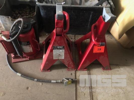 2 x HEAVY DUTY TTI, 3,000kg RATED VEHICLE STANDS & TTI PNEUMATIC/HYDRAULIC BOTTLE JACK, 20T RATED