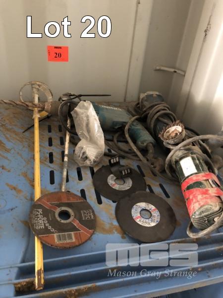 MAKITA HP1631 HAND DRILL, FORWARD/REV & HAMMER, 240V, BOSCH GWF7125 ANGLE GRINDER, 115mm, BOSCH ANGLE GRINDER WITH WIRE BRUSH 240 VOLT & 2 x PAINT STIRRERS