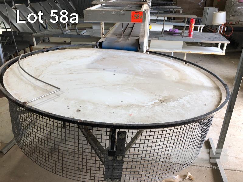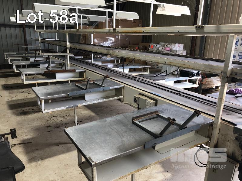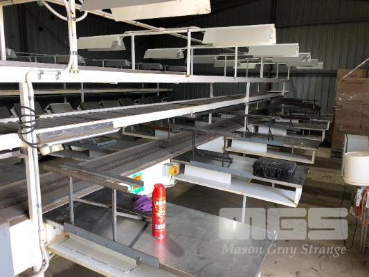PACKING LINE 480mm (W) BELT CONVEYOR, 9m (L) APPROX 12 x OVERHEAD FLUROS 240V DRIVE MOTOR OVERHEAD ROLLERS, 2 LEVELS WITH MULTIPLE GPO'S, ROTARY TABLE & DRIVE WITH OVERHEAD FLURO LIGHTING