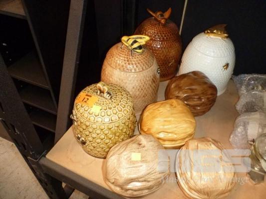 4 x CERAMIC WALNUT DISH BOWLS & 4 x BEE COOKIE JARS