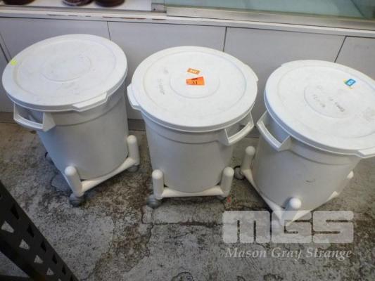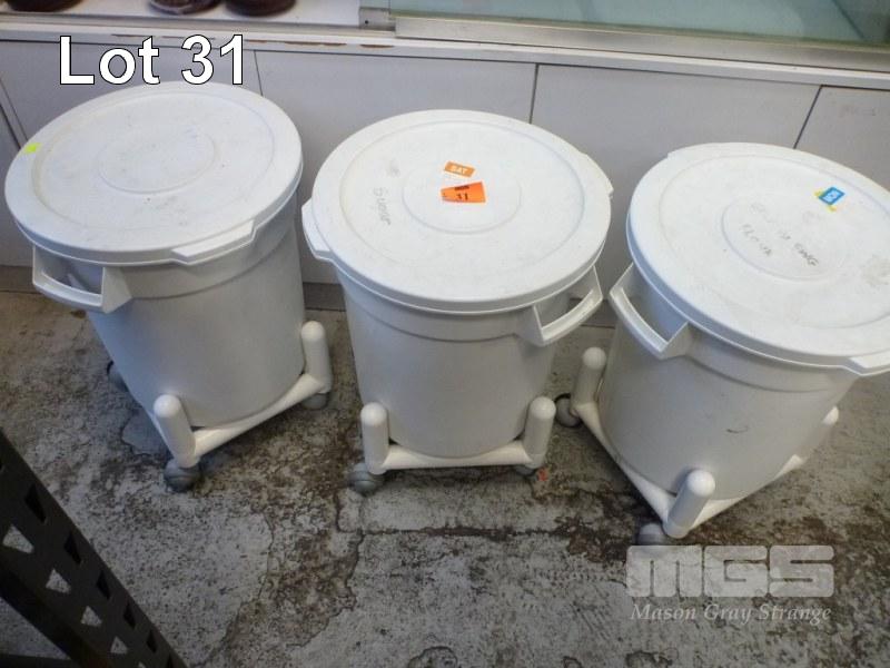 3 x INGREDIENTS BINS, RUBBERMAID, 38 LITRE & DOLLIES