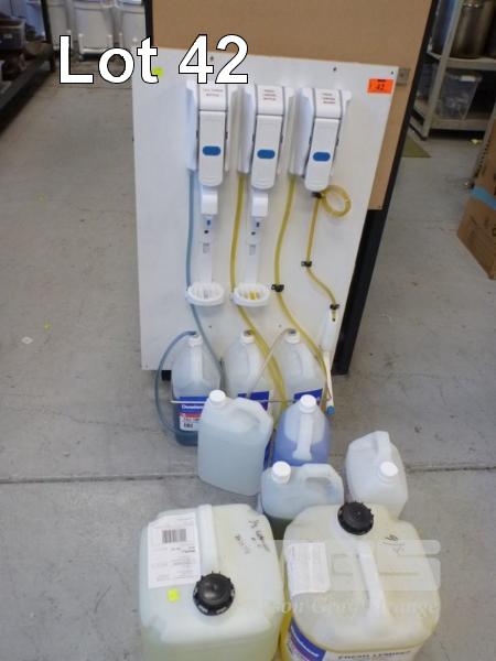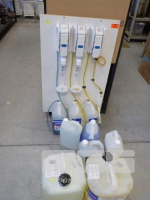LIQUID DISPENSING UNIT & 5 x DRUMS ASSORTED CLEANING LIQUID