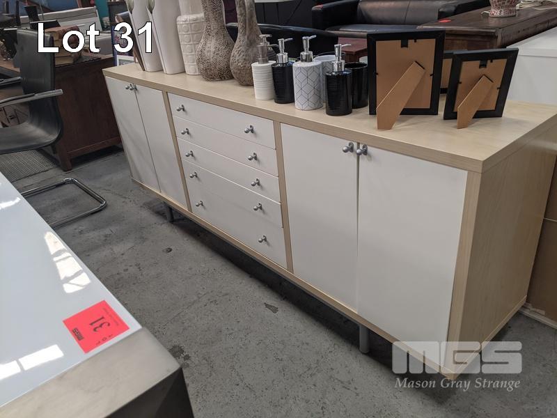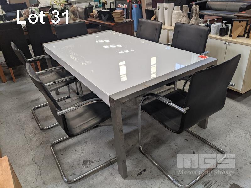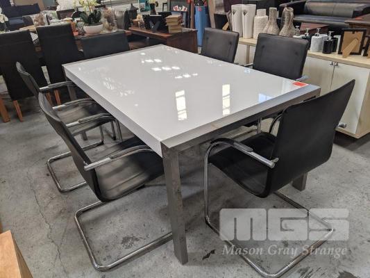 HIGH GLOSS WHITE DINING TABLE, 190 x 105cm WITH STAINLESS STEEL LEGS/TRIM, 6 x CHAIRS & BUFFET