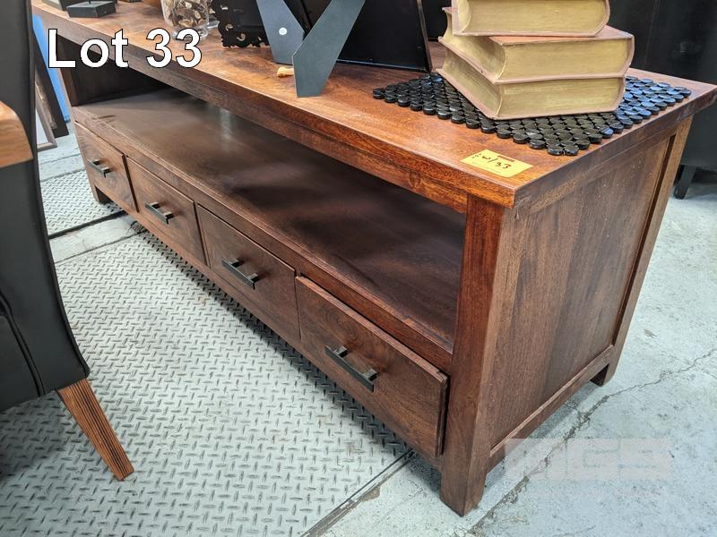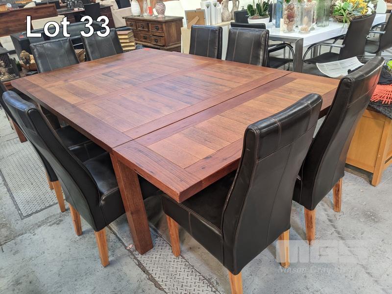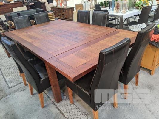 TEN SEATER EXTENDABLE DINING TABLE, 240 x 140cm, TASMANIAN BLACKWOOD LOOK, 8 x MID BACK DINING CHAIRS & 4 DRAWER BUFFET