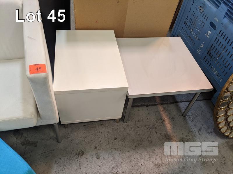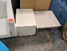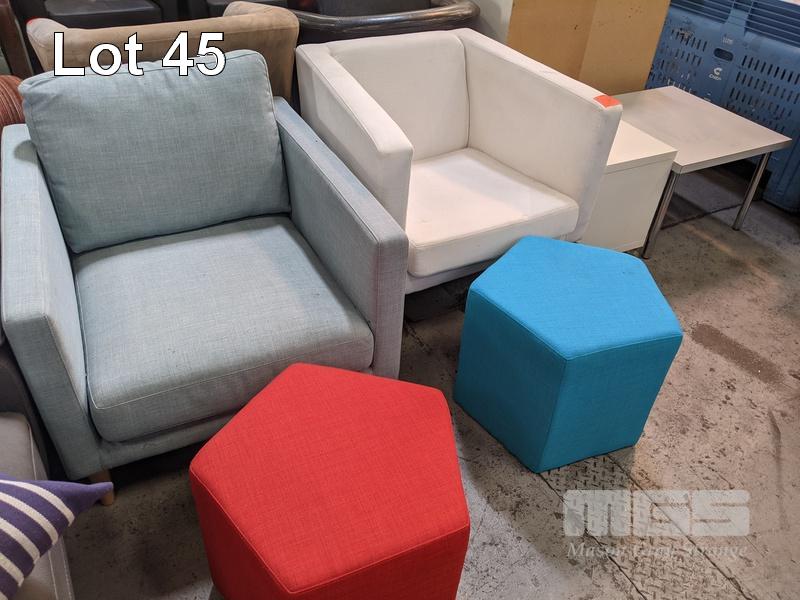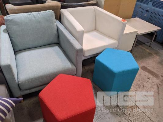 2 x FABRIC ARM CHAIRS, 2 x SIDE TABLES & 2 x PENTAGON FABRIC OTTOMANS