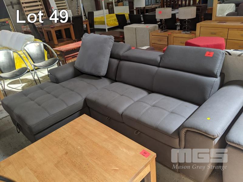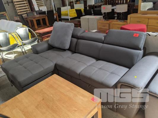 3 SEATER FUTON SOFA BED, GREY VINYL WITH LIFT UP STORAGE & ADJUSTABLE HEAD REST