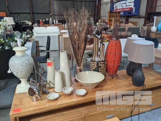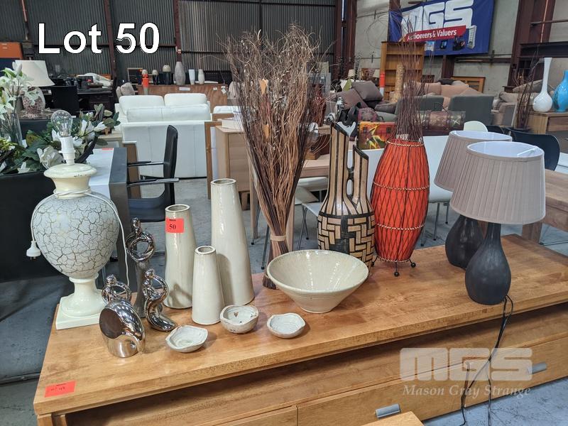 ASSORTED ORNAMENTS, LAMPS, FIGURINES, VASES,BOWLS, BRIDGE & SPOUT WATER JUG, DRIED GRASS BUNDLES, ETC