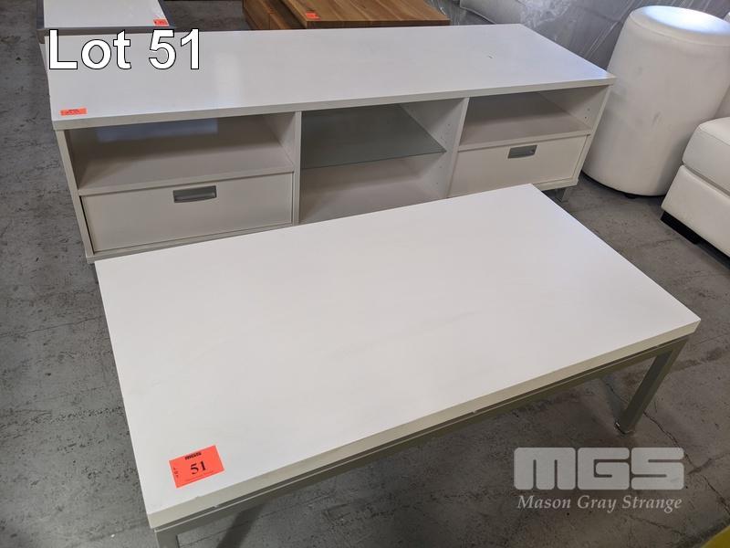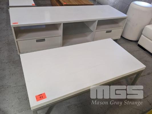 WHITE LAMINATE COFFEE TABLE, 115 x 60cm STEEL LEGS & MATCHING ENTERTAINMENT UNIT, 180 x 60cm