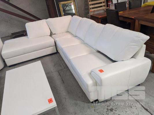WHITE LEATHER LOOK 5 SEATER MODULAR LOUNGE & MATCHING PAIR OTTOMAN BAR STOOLS