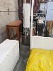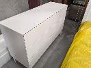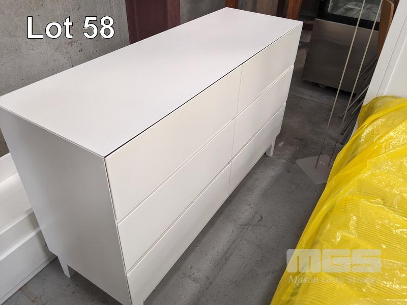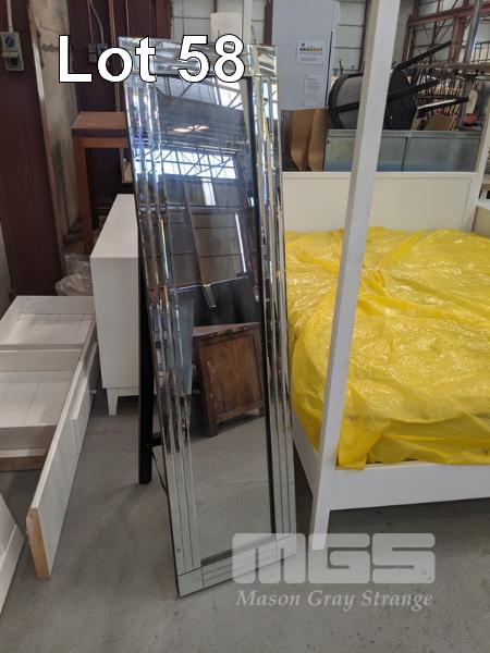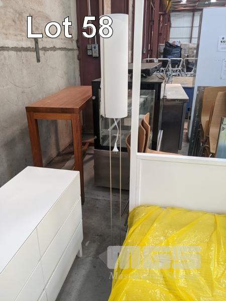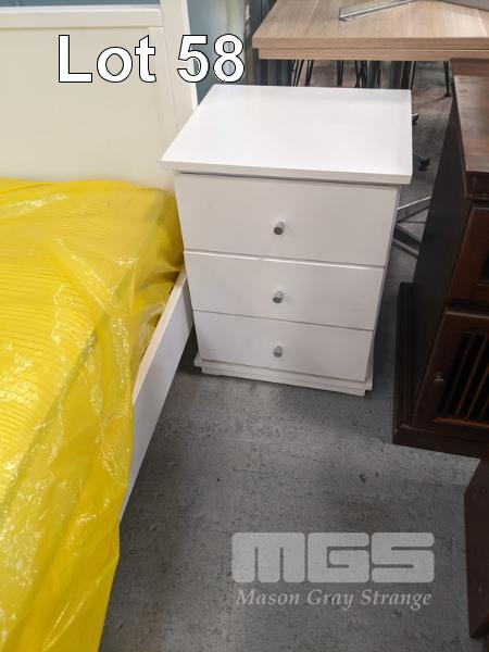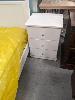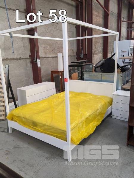 BEDROOM SUITE, WHITE, QUEEN 4 POSTER BED & MATTRESS, SIDE TABLE, FLOOR LAMP & MIRROR & CHEST OF DRAWERS
