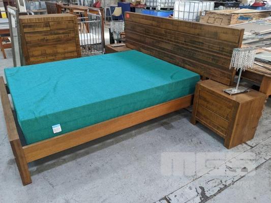 SOLID WOODEN BEDROOM SUITE INC QUEEN BED FRAME & MATTRESS, 2 x BEDSIDE TABLES, 2 x TABLE LAMPS & CHEST OF DRAWERS