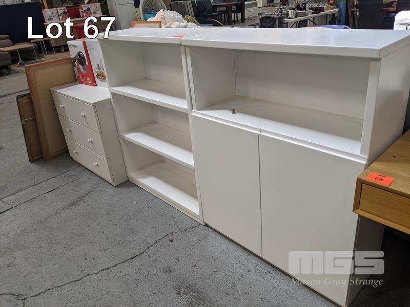 2 x SHELF UNITS & CHEST OF DRAWERS, WHITE