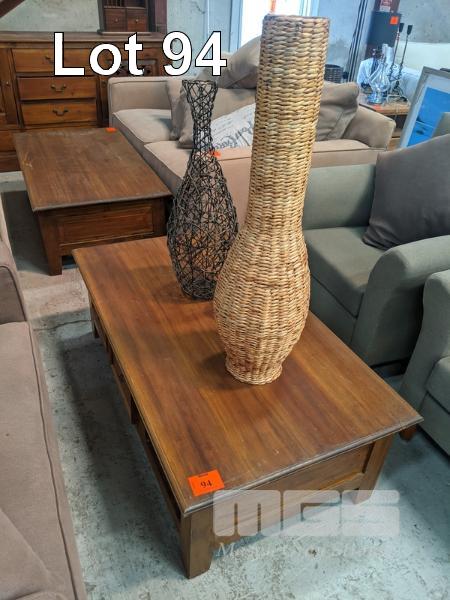 6 x DRAWER WOODEN COFFEE TABLE, 125 x 68cm, 2 x OPEN WOVEN VASES.