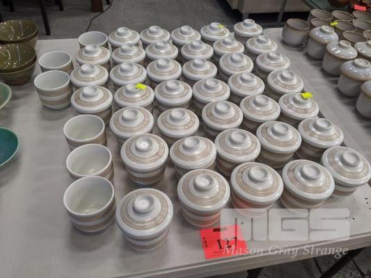 40 (APPROX) x ASSORTED JAPANESE TEA CUPS WITH LIDS, BEIGE WITH STRIPE