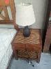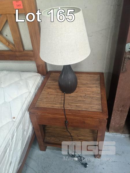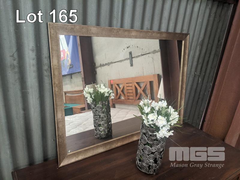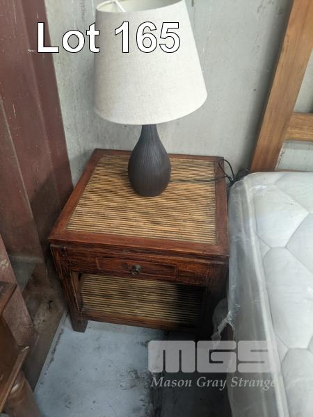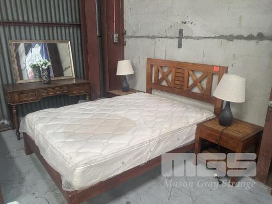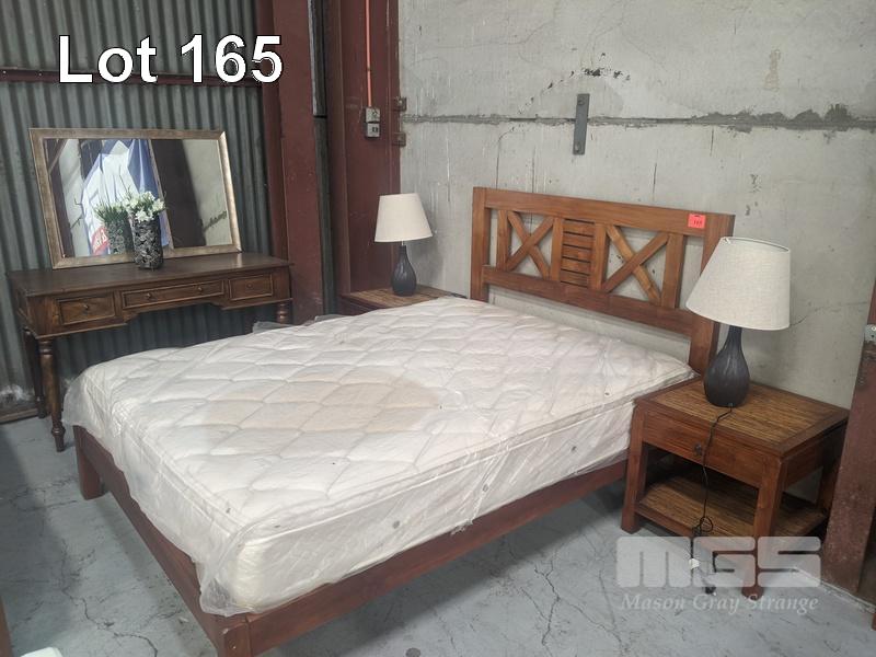 BEDROOM SUITE COMPRISING SOLID TIMBER DOUBLE BED FRAME & MATTRESS, 2 x BEDSIDE TABLES, 2 x LAMPS, 3 DRAWER SIDE TABLE, GOLD FRAMED MIRROR & METAL VASE