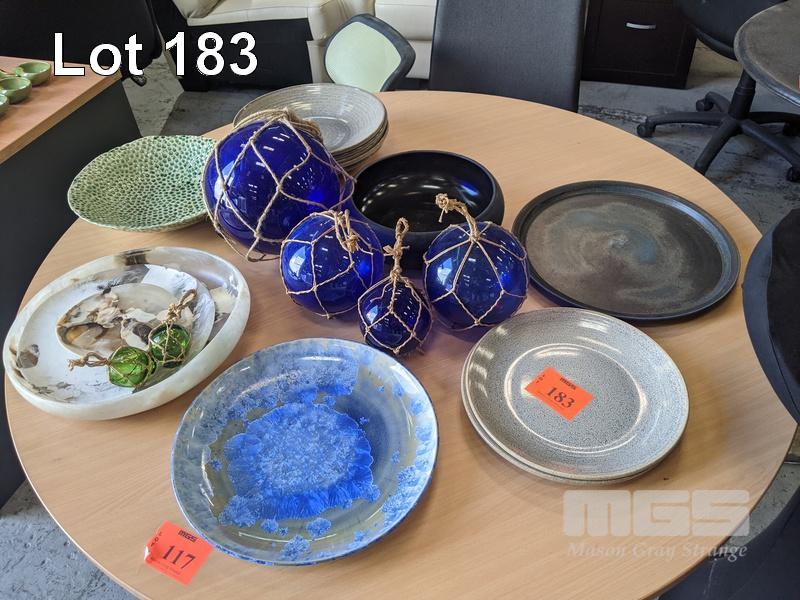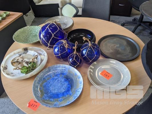 10 (APPROX) x ASSORTED GLAZED CERMIC PLATES & BOWLS. 3 x RESIN SERVING TRAYS. ASSORTED GLASS BALLS.