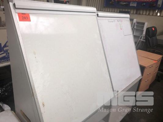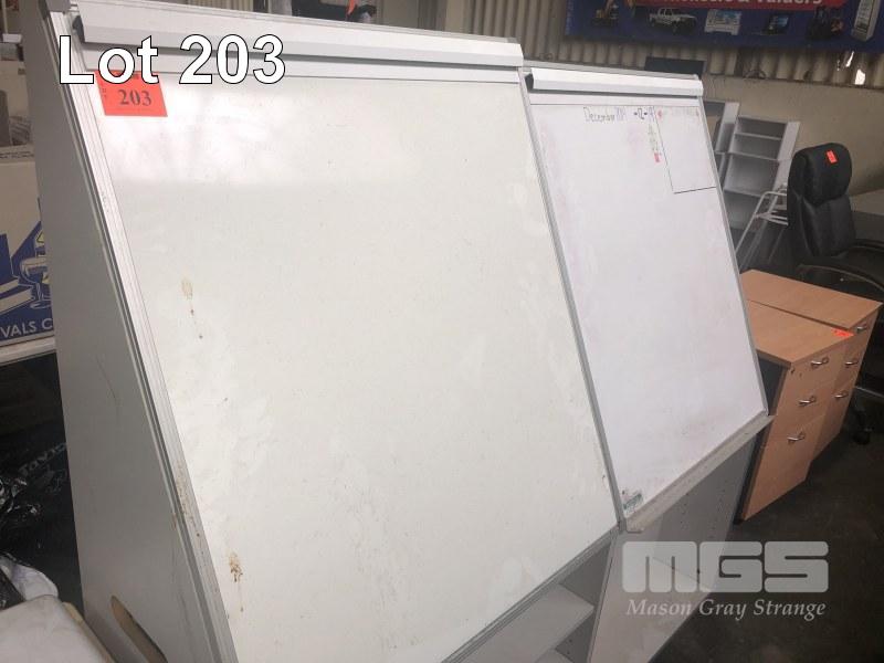 PAIR MOBILE WHITEBOARDS WITH SHELVES, 800 x 900mm, WITH DOCUMENT HOLDERS, CABINET 1500 (H) x 800mm (W)